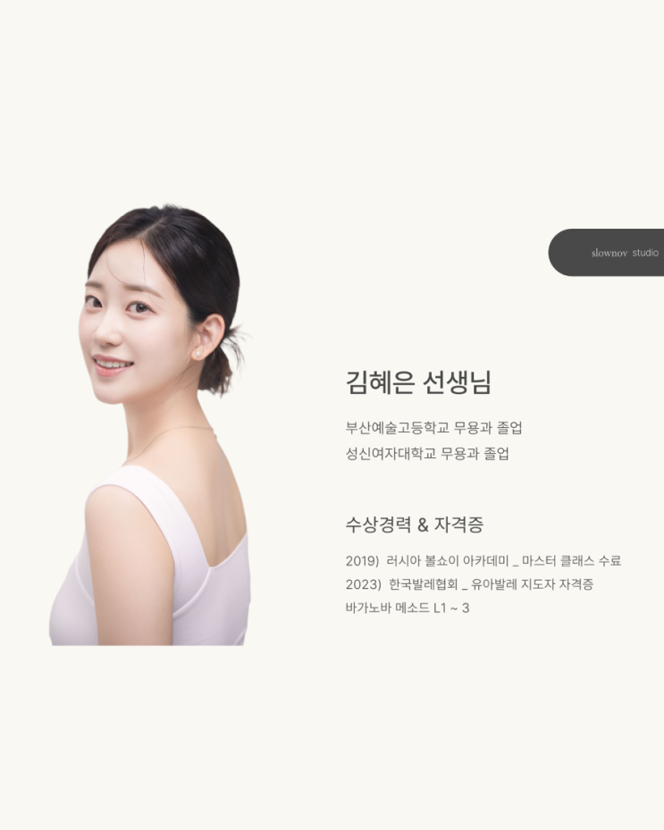3월 슬튜 주말 클래스, 새롭게 아침을 함께할 김혜은 선생님을 소개합니다 토.일 _ 비기너 10:30 / Lv0.5 12:00 핵심을 정확하게 짚는 큐잉으로 발레의 기초를 탄탄하게 만들어드립니다! 동작의 원리를 이해하고 완성도로 연결하는 밀도 높은 수업입니다 흔들림 없이 기본기를 쌓아가는 시간, 단단하고 힘 있는 티칭을 경험해보세요 ♡ 슬튜 문의 <img src="https://blogthumb.pstatic.net/MjAyNjAyMjRfMjMg/MDAxNzcxOTAyNzA3NjIx.BYsh6SCc_bwGOCNtFELO9M5D0suORa3wP1fIBMvfsrkg.APKIEYE33MMjQytOM7ey6kAfqYMVh4b_RG6t8sNM4MEg.PNG/IMG%A3%DF4748.PNG?type=s3" />