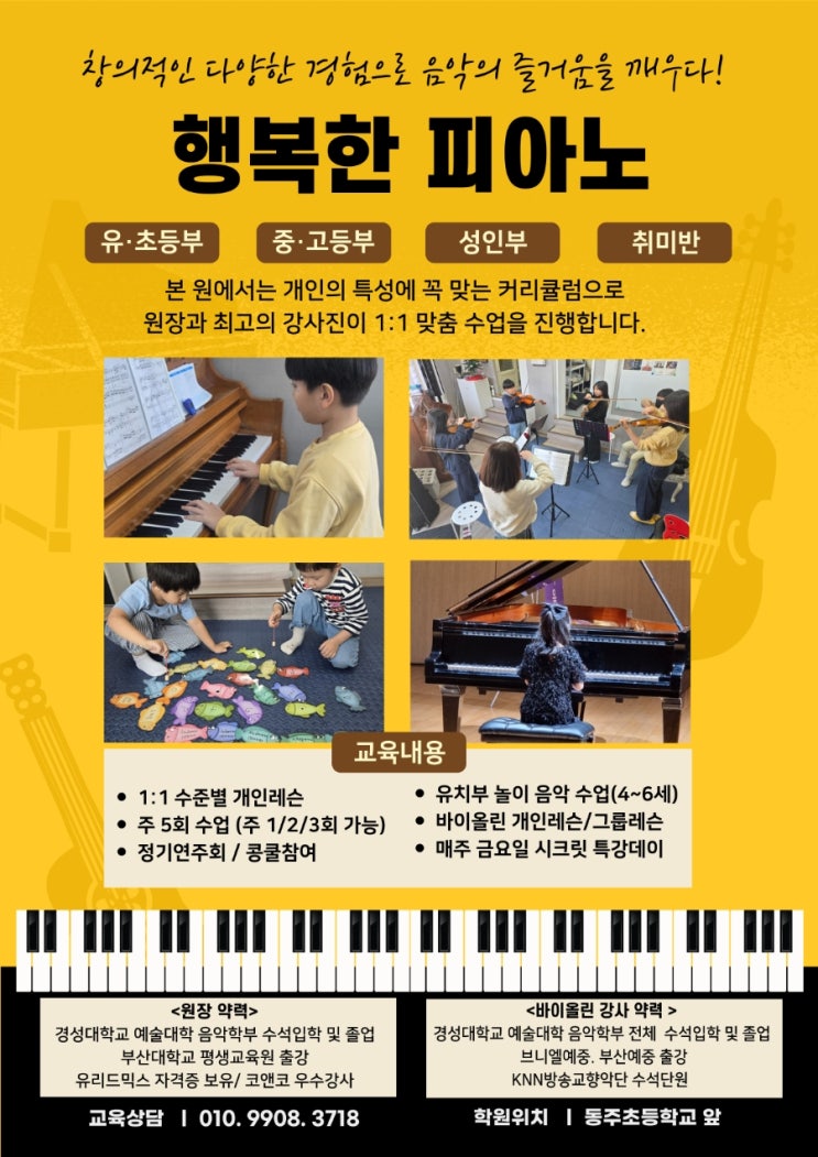 안녕하세요~ 날씨가 조금 풀린듯 하더니 다시 한파가 시작된다고 하네요ㅠ 모두들 감기조심하세요~ 피아노와 바이올린 두가지 다 배울 수 있는 학원을 찾으신다면 행복한피아노로 오세요^^ 피아노&오르간 복수전공 원장의 1:1 맞춤수업 바이올린 전공의 최고의 강사진이 유아부터 성인까지 맞춤 수업을 진행합니다 ㆍ ㆍ ㆍ ㆍ #성인피아노 #바이올린 #사상구피아노 #바이올린학원 #유아바이올린 #성인바이올린 #피아노학원추천 #바이올린학원추천 #유아피아노 #놀이음악 <img src="https://blogthumb.pstatic.net/MjAyNjAxMTlfNDgg/MDAxNzY4NzkwNDYwMDIw.u7hc4GGF6fWfD67itQXzb8I8gAx3KiKS_sJPCYmxW_Yg.OqQzXAEM-1oqMjcDqnclINYMjATmJblovskVuHZ1xIYg.JPEG/900%A3%DF1768379520455.jpg?type=s3" />