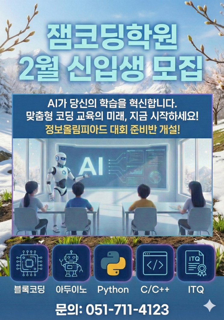 안녕하세요! 부산 잼코딩학원입니다. 어느덧 겨울방학도 절반이 지나가고, 새 학기를 준비해야 하는 2월이 다가오고 있습니다. 우리 아이들의 코딩 교육, 어디서 시작해야 할지 고민이신가요? 20년 이상의 대학 강의 경력인 원장님이 직접 꼼꼼하게 지도하는 잼코딩학원에서 해답을 찾아보세요! 잼코딩학원만의 특별함 1. 검증된 전문가의 직강 대학 강단에서 20년 넘게 프로그래밍을 가르쳐온 노하우로, 아이들의 눈높이에 맞춰 쉽고 정확하게 코딩의 원리를 가르칩니다. 단순 암기가 아닌, 컴퓨팅 사고력을 키워주는 교육을 지향합니다. 2. 기초부터 실전 대회까지 완벽 로드맵 코딩을 처음 접하는 초등학생부터 입시와 대회를 준비하는 중....... <img src="https://blogthumb.pstatic.net/MjAyNjAxMjdfMTY0/MDAxNzY5NTA0MjgyODEz.I2Op6TYUecT2l8gbpWaQQzw_xr5z97jzXfOX4h3wfzgg.t5BFtKcDcCRTVj7z8dlCsLbZykOEsCadVRLwAKTMoBUg.PNG/Gemini_Generated_Image_zae81jzae81jzae8.png?type=s3" />