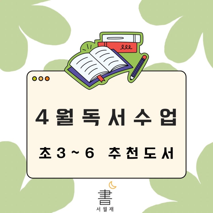 글을 읽고 생각하며 성장하는, 서월재 국어 학원입니다. 책은 읽고 있는데, 아이의 이해력이나 성적은 그대로인 경우 많으시죠? 따뜻한 봄과 함께 새 학기가 시작되었습니다. 4월은 아이들의 학습 방향을 잡아주는 중요한 시기입니다. 특히 독서는 단순히 ‘많이 읽는 것’보다 제대로 읽고, 이해하고, 생각하는 과정이 훨씬 중요합니다. 서월재에서는 4월 한 달 동안 아이들이 ‘읽는 힘’을 넘어 ‘생각하는 힘’을 기를 수 있도록 독서 수업을 구성했습니다. < 4월 선정 추천 도서 안내 > 저학년 (3~4학년) 1. 샬롯의 거미줄 농장의 돼지 윌버와 거미 샬롯이 서로를 지키며 우정을 나누는 이야기로, 아이들이 타인을 이해하고....... <img src="https://blogthumb.pstatic.net/MjAyNjA0MDNfMTA4/MDAxNzc1MTkyNTA1MTIz.lsC2ZQw6pI3qKD8eB7hCLdL73mNM7KFBQus8ULNs7OEg.1RTaSX8JUYDRktQrU7E2PqugGxRl8a2wlemtQ24nh-4g.JPEG/IMG_7435.JPG?type=s3" />