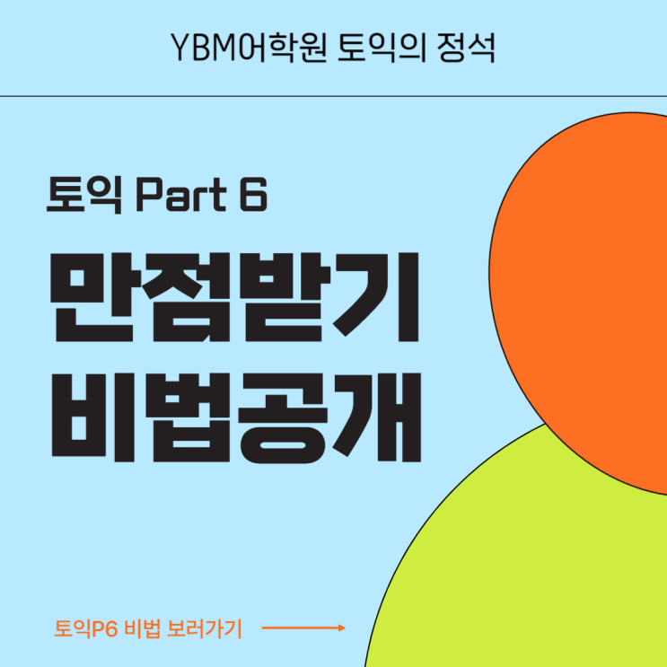 토익 Part 6 는 토익 Part 5 문법/어휘 + 토익 Part 7 독해력 이 2가지가 필요해요. 그래서 처음 토익공부 시작하거나 하실 땐 토익 Part 5 + Part 7 이 2가지 파트 학습을 먼저 하세요! 토익 만점강사인 제가 강의실에서 수업하는 토익 꿀팁 그대로 알려드릴게요. 토익 Part 6 문제 유형은 딱 "3가지만" 기억하세요. G - Grammar 문법 V - Vocabulary 어휘 S - Text Completion 문장삽입 Part 6 문제 푸시기 전에 GVS 이런 식으로 문제 유형을 먼저 분석한 후에 풀면 문풀시간을 좀 더 단축시키실 수 있어요. 또 다음 번에 꿀팁 알려드릴게요! 민경쌤한테 바로 상담 카카오톡 ID : toeicholic (수업/업무 중 답이 늦을 수 있어요) 민....... <img src="https://blogthumb.pstatic.net/MjAyNjA0MDNfMTc0/MDAxNzc1MTgyMjQ0ODM4.lMp-5RVthu4cpJCzn-3o6sQrvdM4BhgaCLxZTahujlsg.lJZ4L90kXzW6-56VkiUFgzHnlEMfEyuonsrd-DCt5sUg.PNG/001.png?type=s3" />