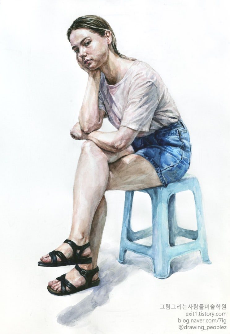 [인물수채화 / 학생작] 베이지 반팔티, 청반바지를 입은 여성