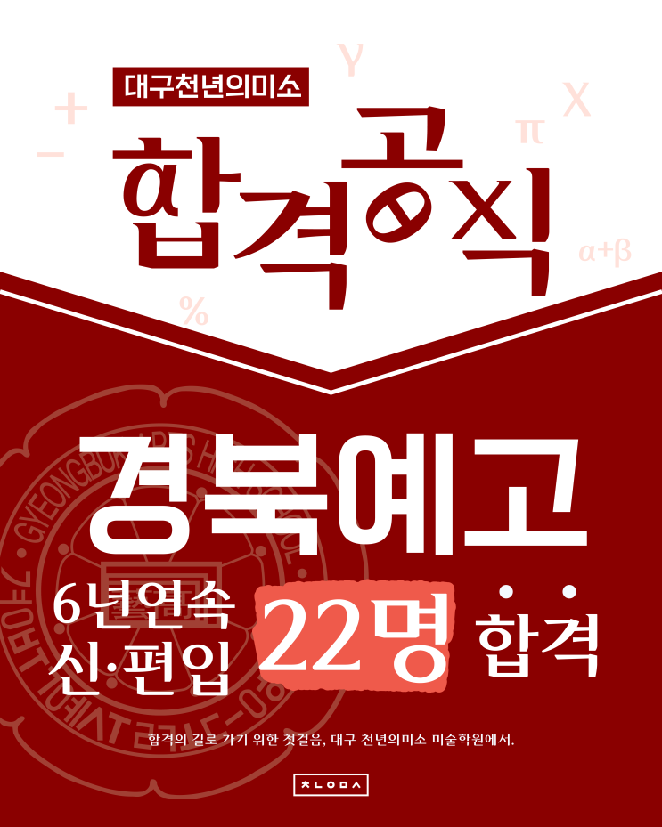 안녕하세요! 대구천년의미소입니다. 변덕스런 봄날씨에 모두 건강하게 지내고 계신가요? 스치고 지나가버린 벚꽃시즌의 아쉬움을 달랠 화사한 소식! 대구천년의미소의 노하우가 돋보이는 경북예술고등학교 신·편입 합격 소식입니다. 대구입시미술학원 대구천년의미소는 미대입시 뿐 아니라 예고입시에서도 탄탄한 커리어를 쌓아가고 있는데요! 바로 대구에 위치한 경북예술고등학교 입시에 강한 면모를 가지고 있답니다. 대구천년의미소는 최근 6년간 매년 연속해서 경북예고 신·편입 입시에서 22명의 합격생을 냈습니다. 신입생의 경우 일반전형으로 합격한 학생들 모두 정물소묘로 시험을 쳤는데요~ 대구천년의미소 중등부는 기초부터 심화까지....... <img src="https://blogthumb.pstatic.net/MjAyNjA0MDdfMjUz/MDAxNzc1NTYzMzgyMjUy.FLm66DO-uFrCdECYpreUTWtclaX18baBzdddQc1jyCMg.opitmh7VVdJXRLHd3YmrpO1rxokEwRNef_NBO8L_fgYg.PNG/2026%C7%D5%B0%DD%B0%F8%BD%C4_%B0%E6%C8%F1%B4%EB_%C7%A5%C1%F6_%BB%E7%BA%BB.png?type=s3" />