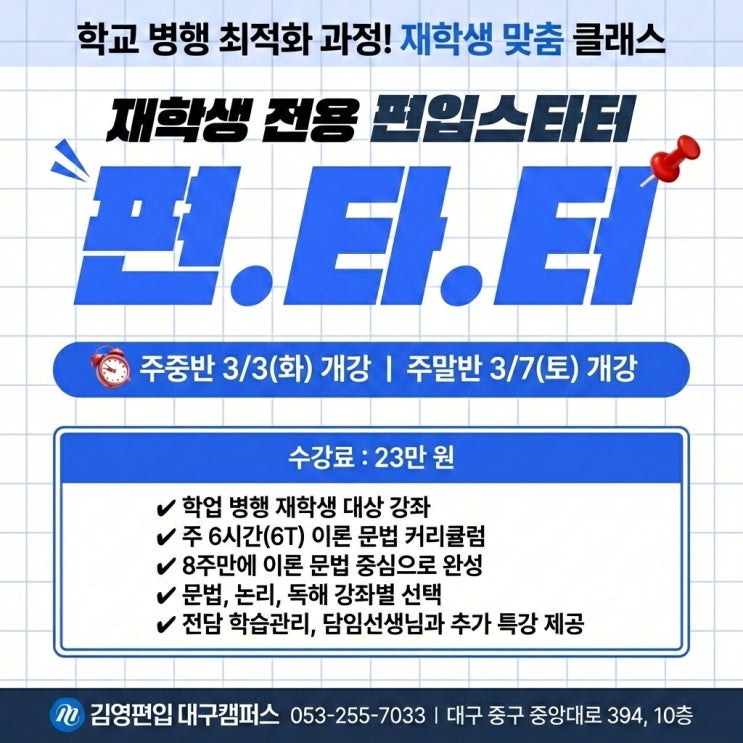 학교 다니면서 편입 준비하기 막막하셨죠? 학업 병행에 최적화된 재학생 맞춤 선택 클래스! 김영편입 대구캠퍼스 **[재학생 전용 편입스타터: 편.타.터]**가 개강합니다! 시간은 부족하고, 베이스는 다져야 하는 재학생 여러분을 위해 딱 필요한 것만 압축했습니다. 편.타.터 핵심 포인트 ✔ 재학생 맞춤: 학업과 병행하기 좋은 최적의 커리큘럼 ✔ 효율적인 시간: 주 6시간(6T) 투자로 부담 ZERO! ✔ 단기 속성: 8주 만에 이론/문법 완벽 중심 완성 ✔ 선택형 수강: 문법, 논리, 독해 중 내게 필요한 강좌만 쏙쏙! ✔ 밀착 관리: 전담 학습 관리 & 담임 선생님의 든든한 추가 특강까지 개강 일정....... <img src="https://blogthumb.pstatic.net/MjAyNjAyMjVfMjEz/MDAxNzcxOTc3NDkzMzgx.9s6Zn-COaltYUWfIYG6_h8mj-aV5ZLzWazBWU34LaDYg.m5bauwv6NzwoMn0w7tpMcIgESyYIQI0tQje8WnTdC9Eg.JPEG/%B4%D9%BF%EE%B7%CE%B5%E5_%288%29.jpeg?type=s3" />