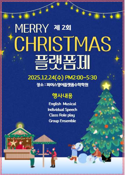안녕하세요, #평리동파머스영어플랫폼수학학원 입니다 다가오는 #24일 #수요일 에는 본 학원에서 #크리스마스 #성탄행사 #발표회 가 있습니다 그 동안 연습해 온 발표회, #플린이들 을 격려해주시고 응원해주세요 *당일행사는 녹화 후, 학부모님들께 발송 될 예정이랍니다 - 언제든지 문의 주세요! 053-551-3911 #평리동영어 #평리동초등영어 #평리동초등전문영어 #유아영어 #평리동유아영어 #평리동파닉스 #수학 #오해 #정승제 #사고력 #평리동수학 #초등 #중등 #고등 #사고력수학 #문해력수학 #오창영논술수학 #다비수 #서구 #영어 #초등선행 #중등선행 #고등선행 #대구다비수 #대구오창영 #서구다비수 #평리동다비수 #논리적사고 #교육 #창의....... <img src="https://blogthumb.pstatic.net/MjAyNTEyMjJfNzcg/MDAxNzY2MzkxMjM5Nzgz.UfDeLOmSpIpYW53_u8P87cDy9yPnAkRTO-t7C11MC2gg.Pko_eBaoI2aUINeDbHzsRpZqmRwnLR8YrzrK6LRDEPIg.PNG/IMG%A3%DF9522.PNG?type=s3" />