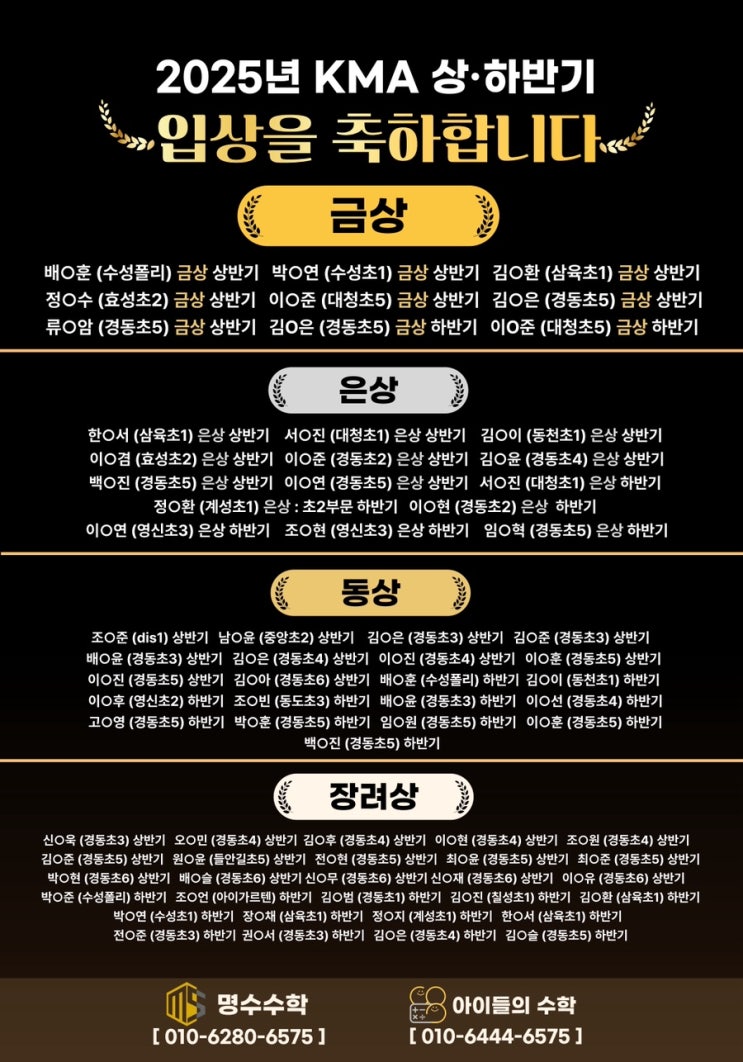 2025 상•하반기 KMA 수학경시 결과, 최우수학원, 우수지도교사상 - 범어유초등수학 아이들의 수학