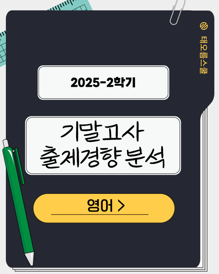 안녕하십니까? 태오름스쿨입니다. 이번에는 2025학년도 2학기 중등부 영어 기말고사를 마친 후, 학교별 출제 경향을 정리한 영어 분석 카드뉴스를 공유드립니다. 영어 역시 학교별 성격 차이가 매우 뚜렷하게 드러난 시험이었고, 준비 방식에 따라 결과 격차가 크게 벌어질 수 있었던 시험이었습니다. 2025-2학기 중등부 영어 기말고사 분석 안내 이번 영어 카드뉴스는 평리중 / 중리중 / 청라중 / 서대구중 / 계성중 / 경운중 중2 영어 기말고사를 대상으로 제작되었습니다. 각 학교별로 출제 범위(교과서 단원) 대화문 / 본문 / 문법 / 서술형 비중 난이도 체감 학교별 영어 내신 스타일 시험 총평 을 한 장씩 정리해두었습니다. ✔ 평리....... <img src="https://blogthumb.pstatic.net/MjAyNTEyMjlfMjM0/MDAxNzY3MDEwNDQzODgz.gsfN0M3gu5nrN63aukZcEC815WOzFIiZPCY5lg8SGV8g.hT49vZSgtywJSaxVBrBG1oUmevK41H1Yerp5rEkDgRsg.PNG/001.png?type=s3" />