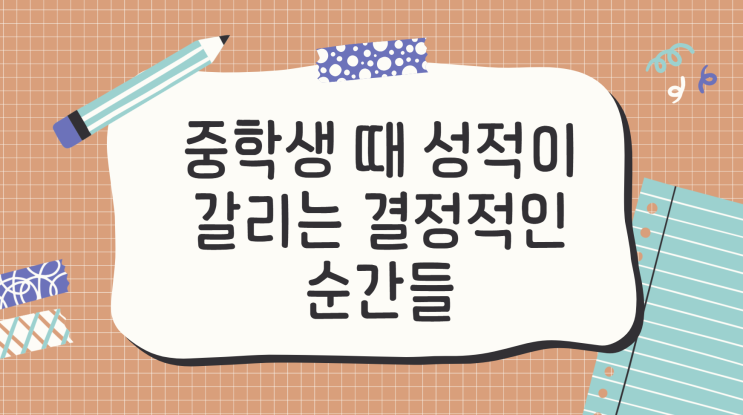 중학교에 올라오면 많은 부모님들이 이렇게 말씀하십니다. “초등학교 때는 곧잘 했는데, 왜 중학교 오니까 성적이 떨어질까요?” 사실 중학생 때 성적이 갈리는 건 아이의 머리 차이가 아니라 어느 순간을 어떻게 관리했느냐의 차이인 경우가 대부분입니다. 오늘은 학생들에게서 가장 많이 보게 되는 중학생 성적이 갈리는 결정적인 순간들을 예시와 함께 짚어보겠습니다. 1️⃣ 자유학기제 이후, 관리가 끊기는 순간 자유학기제 기간 동안은 시험 부담이 적다 보니 공부 리듬이 자연스럽게 느슨해지기 쉽습니다. 중1 자유학기제 때 “지금은 안 해도 된다”는 분위기 시험 대비 경험 없이 갑자기 중간·기말고사 시작 공부 방법을 모른 채....... <img src="https://blogthumb.pstatic.net/MjAyNTEyMzFfNTUg/MDAxNzY3MTUxMTA5MjUz.fQntGKJPB_-fPI-qzbMQ5jnROsMT_KjXxRpwRuI9fP0g.DhmAaBX_b72KhZx5h6XEd4TcHEetz7BoxvPo4wJMJ0og.PNG/image.png?type=s3" />