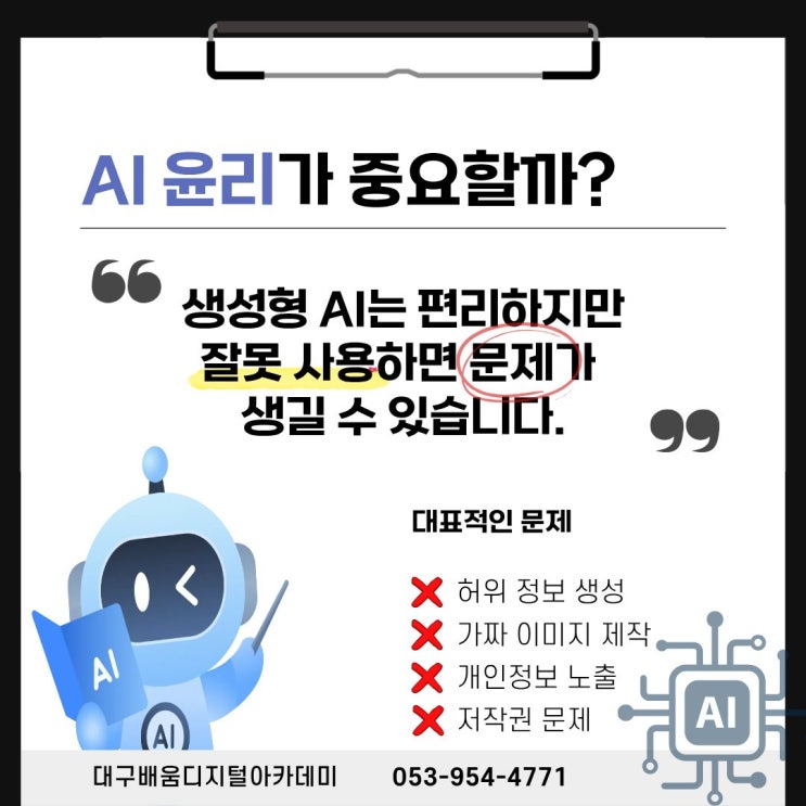 생성형 AI는 우리가 질문하면 텍스트, 이미지, 콘텐츠 등을 만들어 줍니다. 하지만 AI는 완벽하지 않습니다. 잘못 사용하면 다음과 같은 문제가 발생할 수 있습니다. ✔ 허위 정보 생성 ✔ 가짜 이미지 제작 ✔ 개인정보 노출 ✔ 저작권 문제 그래서 지금 전 세계적으로 AI 윤리와 책임 있는 사용이 매우 중요해지고 있습니다. 그래서 지금 전 세계적으로 AI 윤리와 책임 있는 사용이 매우 중요해지고 있습니다. AI 사용의 핵심 원칙 AI를 사용할 때는 몇 가지 중요한 원칙이 있습니다. [ 생성형AI(ChatGPT) 활용 업무스킬 향상 과정 ] 대구배움디지털아카데미에서는 생성형 AI를 실무에 활용하는 교육 과정을 운영하고 있습니다. 교육 내용 1. C....... <img src="https://blogthumb.pstatic.net/MjAyNjAzMDZfMTYw/MDAxNzcyNzg3MjQ0NjMz.ms7L-447z6vbaryQPWP0AtDpAibdmVjFtCVbHBJKx8og.yk7RSQ2oIc89pXI-1yXgieVQKZDZxWp6GgDFRSSG9t0g.JPEG/3.jpg?type=s3" />