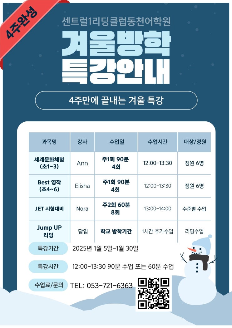 안녕하세요? 원서리딩의 최강자 센트럴1리딩클럽 동천어학원 입니다. 아이들 방학이 코앞으로 다가왔네요. 내일 있을 센클 마켓데이도 기대해 주세요. 이번 겨울 방학 특강 시작일을 변경 합니다. 인근 학교마다 개학일이 달라서 다 맞추기가 힘들었어요. 변경된 스케줄 알려 드릴께요. 영어 글쓰기부터 JET 시험까지, 우리 아이 맞춤형 겨울 방학 플랜 공개 우리 학원만의 차별화 소수정예(정원 6명)-선생님의 눈길이 한 명 한 명에게 닿습니다. 대형 강의에서는 불가능한 1:1 피드백이 가능합니다. 다양한 커리큘럼: 초등 저학년들은 세계 문화 체험수업으로 흥미를 더하고, 초등 고학년들은 영작, JET시험으로 실력 향상의 기회를 굳힙니....... <img src="https://blogthumb.pstatic.net/MjAyNTEyMjNfMTgg/MDAxNzY2NDk3NjA2NDkx.aavCoBklM_4qeG1_znl-3wHguzGyXI2OQu7HgMNNkuIg.RYz4LOPB408Z3CEKZRzFG_Co64RyDZHedPybATrnXPog.JPEG/%B9%E6%C7%D0%BD%C3%B0%A3%C7%A5_%C3%D6%C1%BE.jpg?type=s3" />