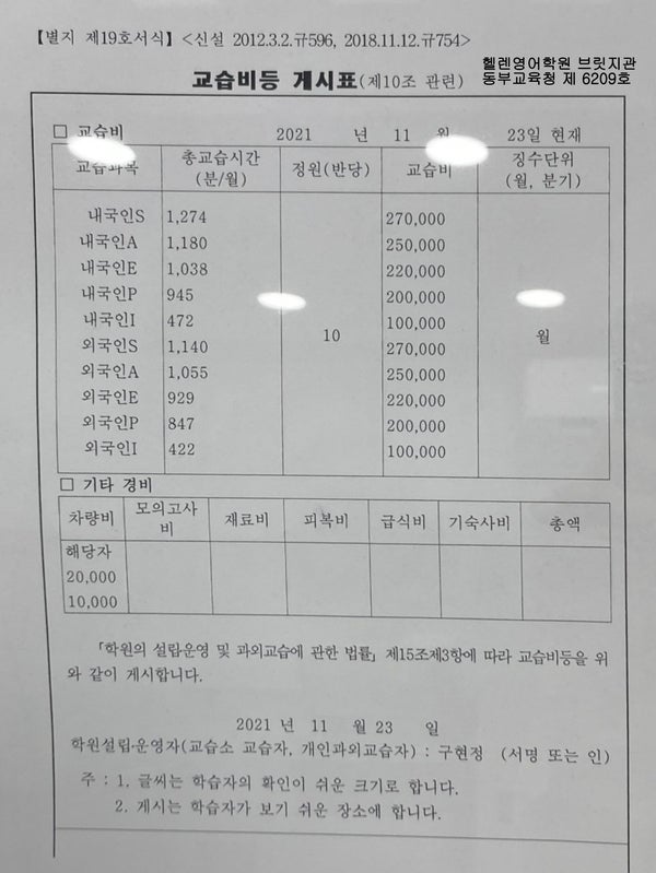 헬렌영어학원(브릿지,프리미어,써밋,투혼) 교습비 게시표