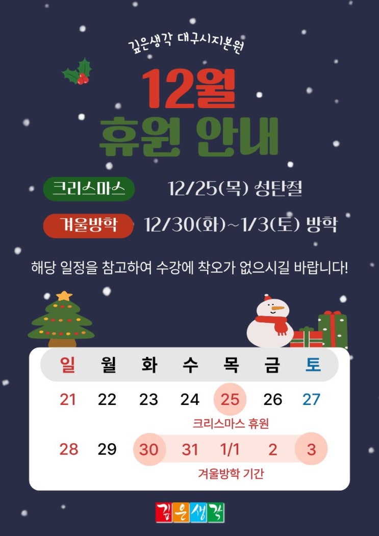 [2025 12월 휴원 공지] 깊은생각 대구시지본원 겨울방학 안내