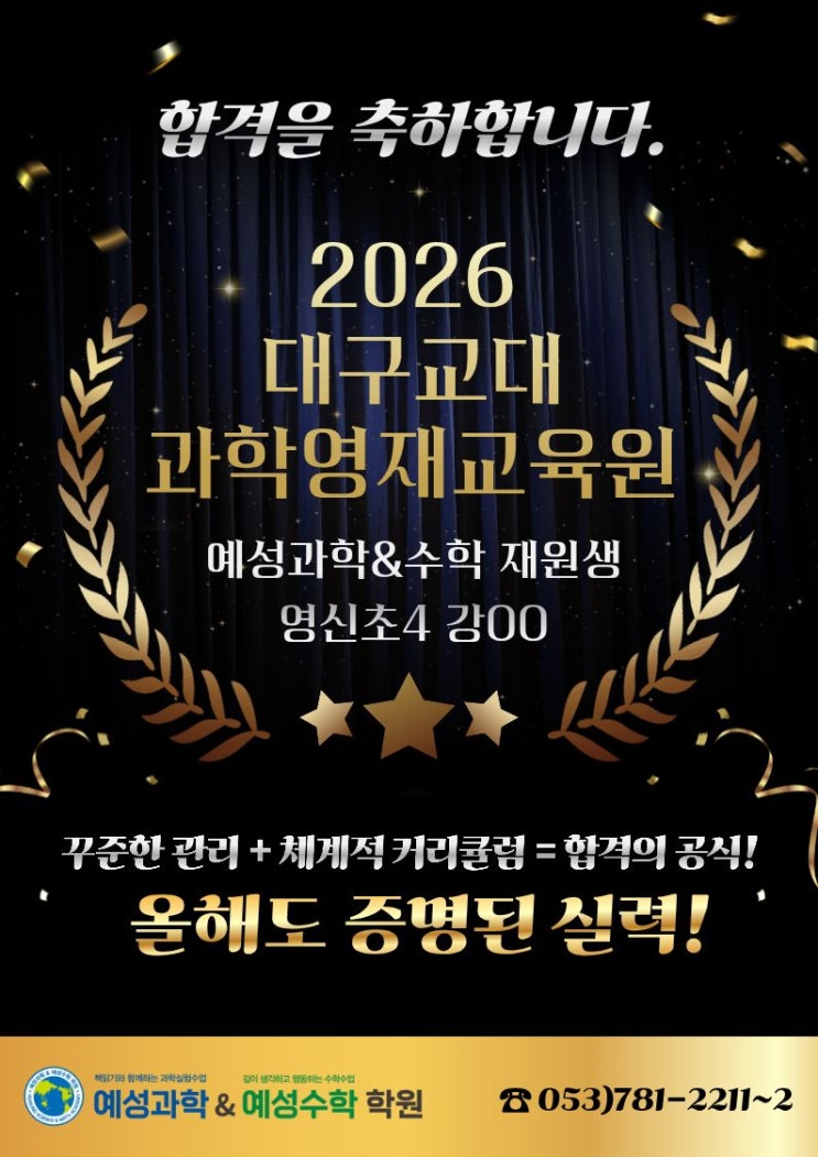 ⭐️ 영재교육원 합격을 축하합니다.⭐️ 2026 대구교대 과학영재교육원 합격을 축하합니다. 예성학원의 수능 10% IN 커리큘럼은 각종 전국대회 및 경시대회 준비가 자연스럽게 따라오게 되는 것‼️‼️ 합격생에게는 수고했다는 인사와 함께 뜨거운 박수와 응원을 보냅니다❤️❤️❤️ ✅️ 수능 20% IN을 향한 예성의 로드맵 ✅️ 교육에! 공부에! 진심인 학원! 궁금하신 점이나 상세 안내는 학원으로 문의 바랍니다. ☎️ 문의 053-781-2211 / 010-5157-3389 위치 : 대구 수성구 달구벌대로 2482 진앤진 빌딩 6층(베스킨라빈스 건물 6층) #대구과학학원 #수성구과학 #범어동과학 #수성구과학학원 #예성과학학원 #예성과학....... <img src="https://blogthumb.pstatic.net/MjAyNjAxMDlfMjE4/MDAxNzY3OTYxOTc2MDUw.K4eT_GuiT__5gc5YXUCIcyHwP_0mZFo7smo_WOjikpQg.lDkghpxJxw1-N53q9ixfOwdMO9MAH3D36sq1QSMq9rAg.JPEG/%C1%A6%B8%F1%C0%BB_%C0%D4%B7%C2%C7%D8%C1%D6%BC%BC%BF%E4-_%BA%B9%BB%E7%BA%BB2.jpg?type=s3" />