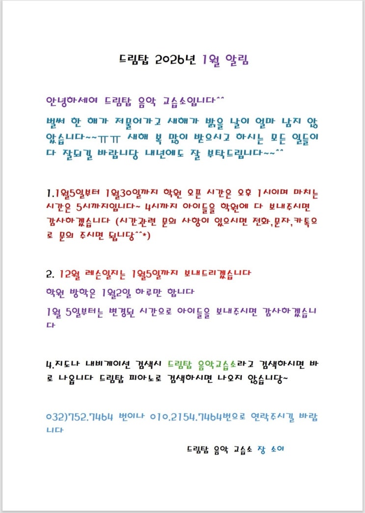 벌써 2026년이네요~ 올한해도 행복하게 모든일들 잘 되시길 기도합니당!! #20206드림탑1월알림 #2026년신입생모집 #피아노원생모집 #우미린2차정문상가2층 #유치부모집_6세7세모집 #어머니반모집 #드림탑음악교습소 #드랍탑음악 <img src="https://blogthumb.pstatic.net/MjAyNjAxMDhfMTgx/MDAxNzY3ODI4MTIzODEz.NtojWiQ9IxEJolaOGlA_HXtB5ANTyRXFzzppB9CGPSEg.2oQsPHuNRufHf4C98io3HDnAhKTEIwxJVchQXlcCWVog.JPEG/a4702e48326427d4a12172c072d53fd2370304a0.jpg?type=s3" />