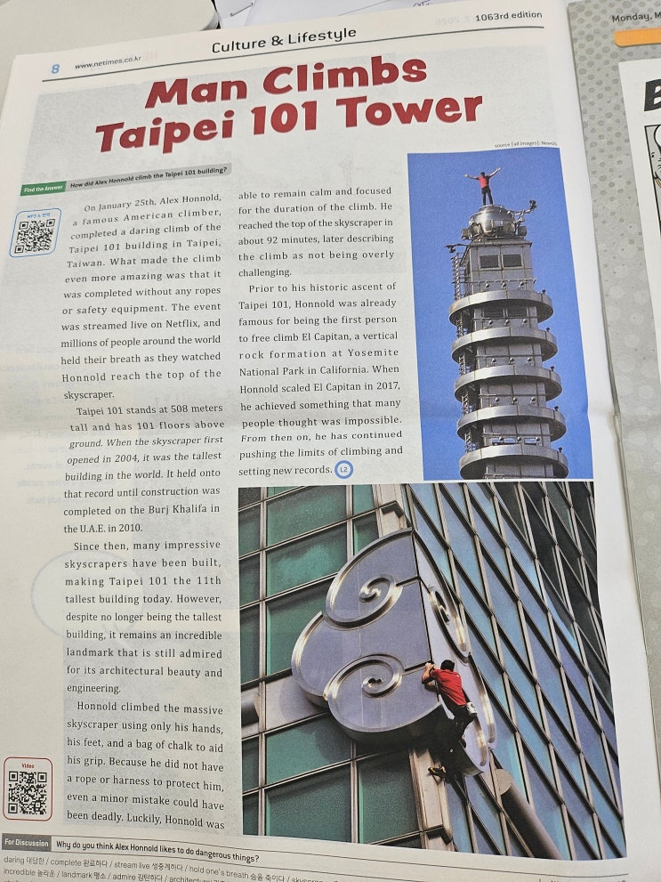 중2를 마무리하고 중3을 시작하는 월, 수, 금 4시 30분 반 영자신문 NE Times 중산고 1학년이 수행평가로 읽히던 신문을 매주 한부씩 수월하게 읽어나가는 아이들 ^^ 매주 15개 내외의 기사를 예비고 수준의 영문으로 술술 읽어나간다 사회, 경제, 역사, 지리, 과학, 예능까지 우리 주변의 일들을 영어로 읽어나가며 영어뿐만 아니라 기초 배경지식을 쌓는데에도 아주 큰 도움이 된다 최근 미국과 이란사이의 전쟁에 관한 기사를 읽으며 유가변동에 다른 우리생활의 변화에 대해 이야기하는 아이들의 눈빛이 우리가 하고있는 이 공부가 영어에만 제한된건 아니라는 듯 호기심이 가득하고 깨달음에 연신 끄덕거리는 고개짓에 나 역시 빠져든다 ^^ ....... <img src="https://blogthumb.pstatic.net/MjAyNjAzMjJfMjM5/MDAxNzc0MTQ4OTYxNDQ2.Mm3nUiTGE06iC0J7vjQL5fJpN62b-xtfk-34jwgASbcg.E9McCqvHXoz3QQRdayoOoVade-69E5C3Wi-w-MwtP6Eg.JPEG/KakaoTalk_20260322_120549212.jpg?type=s3" />