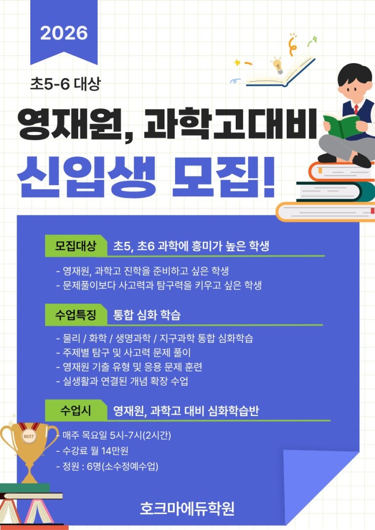 안녕하세요, 호크마에듀학원입니다. 초등 고학년 시기는 단순 개념 학습을 넘어 과학적 사고력과 탐구 능력을 체계적으로 키워야 하는 중요한 시기입니다. 이에 본원에서는 영재원 및 과학고 진학을 목표로 하는 학생들을 위한 과학 심화·탐구 수업을 새롭게 개설합니다. 수업 대상 초등학교 5학년 ~ 6학년 과학에 흥미가 높고 심화 학습을 원하는 학생 영재원 / 과학고 진학을 준비하고 싶은 학생 수업 목표 개념 암기를 넘어선 이해 중심 학습 탐구형 문제 해결 능력 강화 영재원 대비 사고력 및 서술형 훈련 중등·고등 과학으로 이어지는 기초 체력 완성 수업 구성 물리 / 화학 / 생명 / 지구과학 통합 심화 학습 주제별 탐구 및 사고력 문제....... <img src="https://blogthumb.pstatic.net/MjAyNjAzMjNfMjcy/MDAxNzc0MjU0NjU0OTY4.D7_EJo7FJ2L71OksuxNXi19HAWNspzGTXFAqpkihaRwg.CCmiDKGAk1_jIFZ4TVxH5qWoMOpLi12JargAEP4wztwg.JPEG/%C1%A6%B8%F1%C0%BB_%C0%D4%B7%C2%C7%D8%C1%D6%BC%BC%BF%E4._%2825%29.jpg?type=s3" />