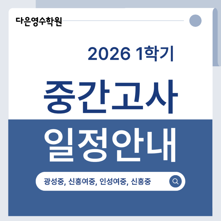 안녕하세요 다은영수학원입니다. 따스한 봄기운과 함께 어느덧 1학기의 반환점인 '중간고사' 시즌이 다가왔습니다. 새 학년이 되어 처음 치르는 시험인 만큼, 학생들도 학부모님들도 긴장과 기대가 크실 텐데요. 다은영수학원은 아이들이 흘린 땀방울이 '최고의 결과'로 이어질 수 있도록 학교별 맞춤형 내신 대비 커리큘럼을 준비했습니다! 2026년 1학기 중간고사 일정 중학교 첫 중간고사가 중요한 진짜 이유는? 1학기 첫 시험인 중간고사는 단순히 한 번의 시험이 아닙니다. 이 시기의 성취도는 중학교 3년 학습의 나침반이 됩니다. 학습에 대한 자신감 첫 시험에서 좋은 결과를 얻었을 때의 성취감은 학생들에게 "나....... <img src="https://blogthumb.pstatic.net/MjAyNjAzMjVfMTk3/MDAxNzc0NDI1NTI2MzUw.Am73IoNku1AF1ciuLC1I7_ZZ8hOuB2VK_MfzsaVq04Eg.qP1TtAIAvWLuREMCZZ5cfFFze-24ZM0CtD2QVhobphQg.PNG/rns.png?type=s3" />