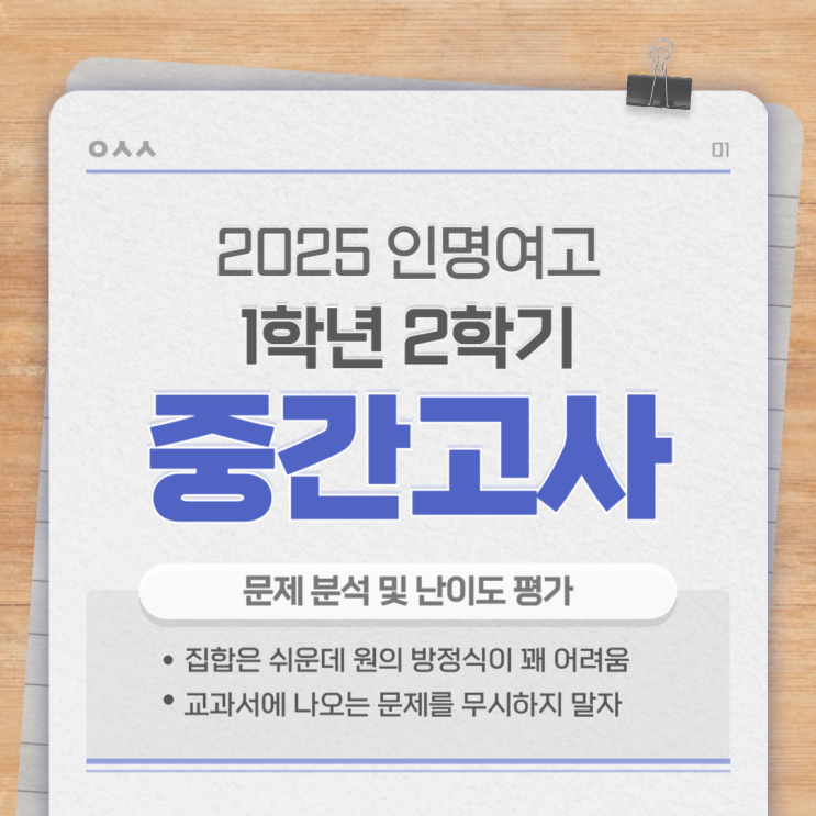 최근 인명여고에 관한 글이 인기가 많다 아마 인명여고에 들어가게 된 친구들이 기대 반 걱정 반으로 검색을 하는 거겠지 어디서든 열심히 하면 잘 될 테니 너무 걱정하지는 말았으면 어차피 거기서 거기야 하는 마음으로 올리는 작년 기출 분석 '공통수학2' 라는 이름으로 낸 첫 시험 2025학년도 1학년 2학기 1회고사의 유형과 난이도를 짤막하게 알아보자 2025년 9월 29일 시행 공통수학2 평면좌표 ~ 집합의 연산 객관식 17 서술형 3 예상대로 쉽지 않았던 인명여고 시험 예전 기출과 비교하면 난이도가 조금씩 내려가고 있지만 그와 더불어 수학을 어려워하는 아이들도 늘고 있으니 어쩌면 쉬워지는 건 당연한 일인가 범위가 좁고 문....... <img src="https://blogthumb.pstatic.net/MjAyNjAyMDFfMjE3/MDAxNzY5OTM1ODAyNDAx.AsjGUyPBO6giT0A78Gc9WSKGSFWOKsyyrGc3Yglq-_Yg.H5k678i8VARCcZayk0mp6Mv5DGy5Rz6UNgPAhQTHJMIg.PNG/001.png?type=s3" />