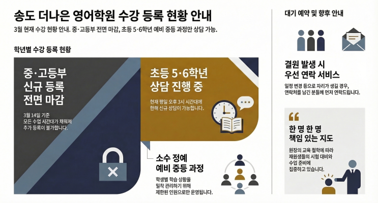 중·고등부 신규 등록 마감 / 평일 3시 초5·6학년 상담 진행 안녕하세요. 송도 더나은 영어학원 원장입니다. 최근 새학년 개학 후 본격적인 중간고사 대비 기간을 앞두고 신규 수업 문의를 주시는 학부모님들이 많습니다. 관심 가져 주시고 연락 주셔서 항상 감사한 마음입니다. 다만 문의를 주시는 학부모님들께 현재 학원의 수업 상황을 미리 안내드리는 것이 좋을 것 같아 이 글을 남깁니다. 중등부 · 고등부 신규 등록 마감 안내(26년 3월 26일 현재 기준) 지난 3월 14일 토요일을 마지막으로 중등부와 고등부 신규 등록은 마감되었습니다. 현재 중등부와 고등부는 추가로 수업을 진행할 수 있는 시간대가 모두 채워진 상태가 되었습니다. 그....... <img src="https://blogthumb.pstatic.net/MjAyNjAzMjRfMjk0/MDAxNzc0MjgyNTU0NzI4.9RApqfFEisz6RVwzDuR6BKf2RgcFOC4lZUgWksuB4ZYg.aAmtH_IeZp_EiJXOR8rcCzL21zS-cdwhhpOX_wm94rsg.PNG/%BD%C5%B1%D4%B5%EE%B7%CF%B8%B6%B0%A8.png?type=s3" />