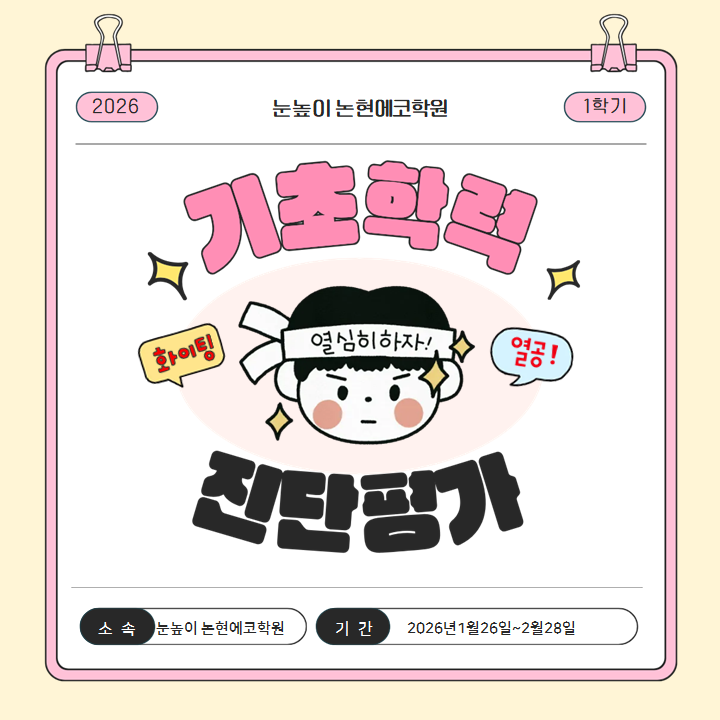 안녕하세요 눈높이 논현에코학원입니다 . 벌써 1월이 지나고 2월 . 곧 3월 입학하고 새 학기가 시작되겠죠 . 이제부터라도 3월을 준비해야할텐데요 . 신학기 준비라면 기초학력평가를 준비해야겠죠 그럼 기초 학력평가는 무엇인지 어떻게 준비해야하는지 고민되시죠 ? 그럼 절차는 어떻게 될까요 ? 기초 학력평가 눈높이선생님과 철저히 준비해봅시다 ! 결손없는 전 학년 학습으로 자신있는 신 학기를 맞이 할수 있도록 해보아요!! <img src="https://blogthumb.pstatic.net/MjAyNjAyMDRfMTM2/MDAxNzcwMTgwOTM4NzY0.12hop0LReSBqw1fW1d6tBZijloZYgeJMFyCs04_QGYgg.ddghKgwG1va4ppwmQs3EP-wZOUGLg-6PcbaHztHE5JUg.PNG/%B1%E2%C3%CA%C7%D0%B7%C2%C6%F2%B0%A1.png?type=s3" />