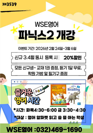 입학을 축하합니다~~~ 우리 학생들이 초등학교를 입학하고, 학년이 올라가는 3월 ~~ 그냥 지나칠 수 없기에~~ 파닉스 2반 신규생에게 드리는 혜택!!! 모아봤습니다!!! 3.4월 동시 등록시 20% 할인 ( 현금결제시) 난...파닉스 2반이 아닌데~~ WSE영어에 처음으로 왔다면??? 등록 기념으로 교재 1권 증정, 듣기 비용 1달 무료, 학원 가방 및 필기구통을 드립니다. 수업에 관련해 궁금하신 사항은 문자나 전화주세요. 2월26.27일은 학원방학이라 학원 전화 연결이 어렵습니다. ㅜ ㅜ <img src="https://blogthumb.pstatic.net/MjAyNjAyMjZfMjAz/MDAxNzcyMTAyNTI2OTI5.4xMO6L6xGRXCTfknILizadkZYMnQm7NvhcZdRfw8Iowg.98VJTAoNDCZn4Hex_RTW3mxiIRrQWmCxjFf0WlF7TKYg.PNG/image.png?type=s3" />