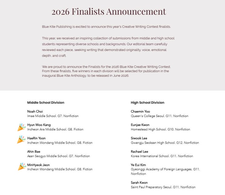 블루카이트(Blue Kite) 출판사의 2026 Creative Writing Contest 결과가 발표되었습니다. 중등·고등 통합 Finalists 11명 중 메이플힐스 학생 3명의 이름이 올랐고, 그 중 3편이 출판 확정, 1편이 Honorable Mention에 선정되었습니다. 숫자만 봐도 반가운 결과지만, 저희는 이번 공모전이 가진 성격에 더 시선이 갑니다. 출판이 확정된 작품들은 2026년 6월 발간 예정인 Blue Kite Anthology에 수록됩니다. 학생의 글이 '제출된 과제'가 아니라 누군가에게 읽히는 작품으로 남는다는 것. 저희 메이플힐스는 이 경험이 학습의 결과이기 이전에, 영어가 하나의 언어이자 표현 수단으로 작용하기 시작하는 순간이라고 생각합니다. 메이플....... <img src="https://blogthumb.pstatic.net/MjAyNjAzMTlfNCAg/MDAxNzczOTA2MDc5ODEy.H76oe3at84PqR_k5m9Bz-KpzYbPr-6tMcLZZkxTHL5Ig.nBzMSVXfNQmuhPwPHDF2uLyIdrVRR_xAcgIYxyi4YP8g.JPEG/%C4%B8%C3%B3.JPG?type=s3" />