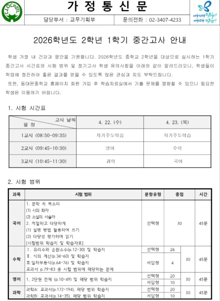 안녕하세요? 한우리 독서토론논술 전국 최초 1호 학원, 친절한 써니쌤입니다. 곧 동대문구 주요 중학교들의 1학기 중간고사 기간이 다가왔습니다. 저희 학원에서는 동대문중학교, 숭인중학교, 대광중학교, 전일중학교, 성일중학교, 청량중학교, 휘경여자중학교, 휘경중학교, 장평중학교, 정화여자중학교, 경희중학교 학생들이 재학중입니다. 1학기 중간고사는 문학(시, 소설)과 문법 단원이 포함되어 있기 때문에 철저한 준비가 필요합니다. 내신은 준비가 성적을 결정하는 시험입니다. 그래서 저희 학원은 학교별 기출 문제 분석과 서술형 문제 풀이 및 오답 관리까지 내신의 흐름을 파악하며, 체계적으로 준비하고 있습니다. 내신의 흐름을 알....... <img src="https://blogthumb.pstatic.net/MjAyNjA0MDFfMzkg/MDAxNzc1MDUwNjIyMzg4.TcpKm6_6WEQliGrHA-idL6HTkyaObJatxiXX7Ywhb9gg.8CNJZfb037zPHVYH9K4fsjpi-vox1XkMHDLX_HF8ElMg.JPEG/KakaoTalk_20260330_204929965.jpg?type=s3" />