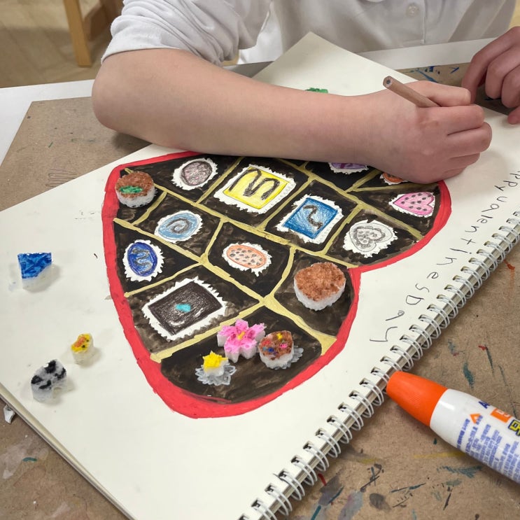 안녕하세요. 포제트 미술학원입니다. 포스팅이 조금 늦었지만, 아이들과 함께했던 발렌타인데이 수업을 기록으로 남겨봅니다. 이번 수업에서는 ‘초콜릿 드로잉’을 주제로, 아이들이 좋아하는 소재를 활용해 즐겁고 몰입도 높은 미술 활동을 진행해보았습니다. 먼저 초콜릿 상자의 형태를 이해하고, 상자 안을 어떻게 구성할지 스스로 계획하는 시간을 가졌습니다. 내가 진짜 받고 싶은 초콜릿 상자를 상상해보며 각자의 개성을 담아 디자인하도록 했어요. 하트 모양, 동그란 초콜릿, 견과류가 들어간 초콜릿, 두쫀쿠까지!! 다양한 아이디어가 담긴 초콜릿을 그림으로 표현해주었습니다. 이번 수업의 포인트는 색다른 재료를 활용한 표현 확....... <img src="https://blogthumb.pstatic.net/MjAyNjAzMjZfNzEg/MDAxNzc0NTA3NzAxNzA3.FS3TBfjxzjR-_WXLBsF0nW43W4e_QumbiJzpliQ2ojwg.mQ71a2mPG2ezxyQltQh-LRR5k8GVOZ0tFIzAyfaDzuIg.JPEG/IMG_4201.jpg?type=s3" />