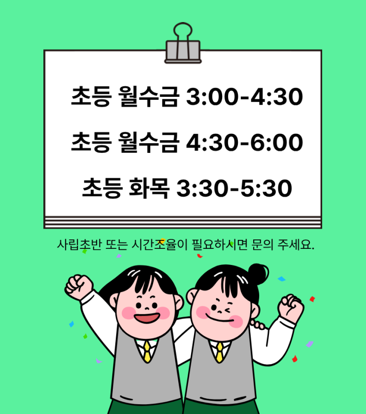 안녕하세요 뮤엠영어치평금호점입니다 신학기 시간표 안내드립니다 월 -금요일 주5일 60분 수업입니다 (Main School 50분 V-System 10분) 수업시간표는 2시 40분에서 7시 30분입니다 (수업 참석가능 시간을 미리 확인 부탁드립니다) <img src="https://blogthumb.pstatic.net/MjAyNjAzMDJfMTgw/MDAxNzcyNDUwNDUxMzcw.9oz6NbGKBkUwU1f7g7kvhuSDVrN2rvinh8xmve4voQcg.DVlPNMI2dMOjROV2qlvjF0EjhdBd4ewPH04KLdQJqkwg.PNG/IMG%A3%DF2010.PNG?type=s3" />