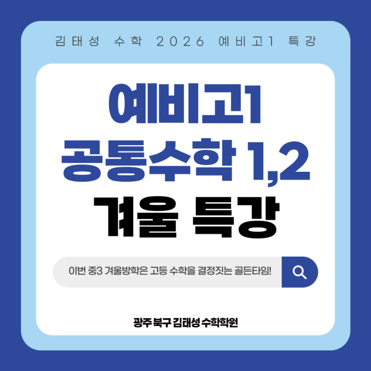 중학교 때는 90점이었는데, 고등 가자마자 40점… 예비고1 겨울방학이 골든타임입니다 안녕하세요! 광주 북구 일곡동 김태성 수학학원입니다. 올 한 해 동안 열심히 공부해온 학생들 모두 정말 고생 많았습니다! 특히 곧 고등학교에 올라가는 예비고1이라면, 급격히 높아지는 고등 수학 난이도 때문에 겨울방학을 편하게 보내기 어려울 수 있어요. “중학교 때는 90점이었는데, 고등 가자마자 40점…” “감으로 풀다 보니 시험 때마다 긴장되고 불안해요.” 많은 중3 학생들이 실제로 고등수학을 가장 많이 걱정하고 있습니다. 고등 수학은 성적을 좌우하는 핵심 과목입니다. 그렇기에 이번 겨울방학은 고등 수학 자신감을 결정짓는 중요한 시기....... <img src="https://blogthumb.pstatic.net/MjAyNTEyMDhfMjQ3/MDAxNzY1MTY1NzM2MDU5.FjOBvXnHw9VrBqnkNPgbmbzki4TyMwSg6HpmC-r1BqMg.J-DNpuWC_IHYDoUnZ1P1rLxDPJ2-ICYUpI1JpDdQLlEg.PNG/002.png?type=s3" />
