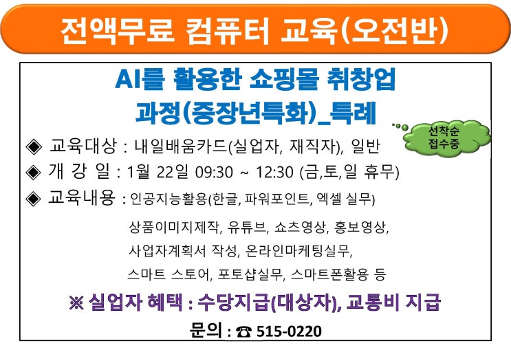 과정명 : AI를 활용한 쇼핑몰 취창업과정(중장년특화) ◈ 교육과정: 내일배움카드 (실업자, 재직자), 바우처카드, 일반 ◈ 개 강 일: 1월 22일 09:30 ~12:30 (금, 토, 일 휴무) ◈ 교육내용: 인공지능 활용( 한글, 파워포인트, 엑셀 응용실무) 이미지수정, 상세페이지 만들기, 스마트스토어 유튜브, 쇼츠영상편집, 홍보영상, 생성형인공지능 활용 마케팅 미리캔버스, 스마트폰활용, 온라인마케팅 등 등 ※ 실업자 혜택: 수당지급(대상자), 교통비 지급 문의: ☎ 062)515-0220 <img src="https://blogthumb.pstatic.net/MjAyNTEyMDhfMjQz/MDAxNzY1MjAwMTMzMzE2.q0U3smgZk0ifhwL_cpagSHJjhq5Acgb-GbppjnpI7YAg.me4YkPV46m1wQyT7HMFsFK8ArrYz-qzpzEVuTItC6J8g.JPEG/1762151568991.jpg?type=s3" />