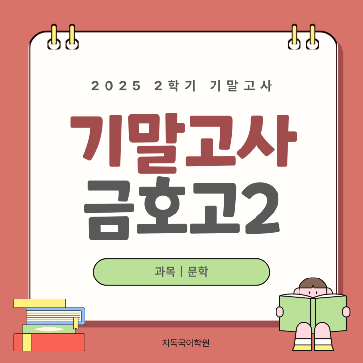 안녕하세요, 지독국어학원입니다:) 금호고2 시험분석입니다~! 시험범위는 교과서 4단원, 씨뮬 모의고사 5~10회, 모의고사 2025.10에서 문학 작품만 출제되었습니다. 시험범위가 매우 방대하고, 명확한 선지와 헷갈릴 수 있는 선지가 함께 출제되어 체감 난이도가 높았을 것으로 예상됩니다. 씨뮬 모의고사와 교과서에서 작품이 함께 골고루 출제되었으며, 표현상의 특징, 갈래 특징, 내용에 대해 꼼꼼하게 공부해야 했습니다! 또한, 교과서도 학습활동 작품까지 꼼꼼하게 공부하는 것이 매우 중요합니다~~!! <img src="https://blogthumb.pstatic.net/MjAyNTEyMDlfNDgg/MDAxNzY1Mjc4MzYwMTYz.i7gY3ogoqTYhMAH6p1ZbPl4Hi7dIPza6FRbBboGoqI4g.9QNC77ZHaVu_uHMT8KWhM2OlMHYfUWlKQhXrNtr1STYg.PNG/1.png?type=s3" />