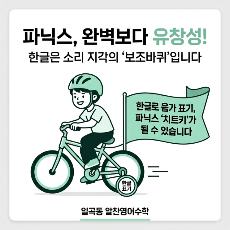 오늘은 조금 민감하지만, 꼭 드리고 싶었던 이야기를 해보려고 해요. 바로 파닉스 배울 때, 영어 밑에 한글 발음을 적어도 될까? 에 대한 고민이에요. 결론부터 말씀드리면, 저희 알찬에서는 '전략적으로' 한글 표기를 활용하고 있어요. "어머, 발음 나빠지면 어떡해요?"라고 걱정하실 수도 있지만, 저희 학원만의 확고한 교육 철학이 담겨 있답니다. 목표는 '완벽한 발음'이 아니라 '거침없는 유창성' 영어는 의사소통의 도구죠. 전 세계 수많은 국가 사람들이 각자의 억양으로 영어를 하지만 소통에는 문제가 없어요. 저희 알찬에서는 아이들이 발음 하나하나에 갇혀 머뭇거리기보다, 문장을 빠르게 읽....... <img src="https://blogthumb.pstatic.net/MjAyNjAzMTlfNzEg/MDAxNzczOTMxMTQzNzQ2.VyhP09jNMrv0wn2wYQc1CnakFtnYnCBYurz6Uhenzhwg.Ctrlbw-MOtyC4aJEtRj8sxtFI-6LEotuLEUX7vBJEWEg.PNG/-_%282%29.png?type=s3" />