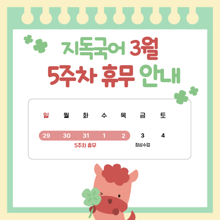 [공지사항] 운암동지독국어 3월 5주차 휴무 안내