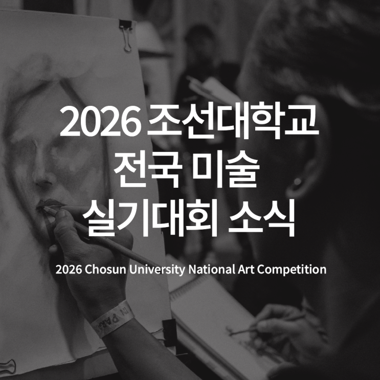 [광주에이맥스미술학원] 2026 조선대학교 전국 미술 실기대회 소식 [광주입시미술학원] 안녕하세요! 에이맥스 미술학원입니다 오늘은 조선대학교에서 치러질 전국 미술 실기대회 소식을 들고 왔는데요! 그럼 함께 확인하러 가봅시다! 2026 조선대학교 전국 미술 실기대회 대회 일시 2026년 5월 16일(토) 10:00 ~ 14:00 (4시간) 2026 조선대학교 실기대회 요강 참가 자격✅ 전국 중·고등학교 재학생 접수방법 온라인 접수 접수기간️ 2026년 4월 1일(수) 00:00~ 5월 16일(금) 24:00 접수처 아트앤디자인 홈페이지 (www.artndesign.com) 여러분들은 "실기대회의 중요성"을 아시나요? 쉽게 비교를 하....... <img src="https://blogthumb.pstatic.net/MjAyNjA0MDJfMTU5/MDAxNzc1MTEwNDE4Nzk0.K2YYgnyUw82UdFVTxJJGKM6LVBiSTrL5uWJ2vxxpwCYg.KGtElDMBGKFV7-scNn_wCVOKc0SHOd7jUlsM6aknEQUg.PNG/2026_%C1%B6%BC%B1%B4%EB%C7%D0%B1%B3_%C0%FC%B1%B9_%B9%CC%BC%FA%BD%C7%B1%E2%B4%EB%C8%B8_%BC%D2%BD%C4.png?type=s3" />