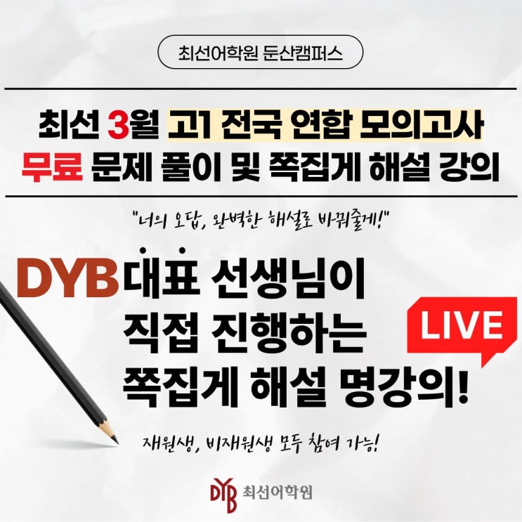 모의고사 쪽집게 강의 DYB 26년 3월 고1 모의고사 영어 영역 무료 해설 특강 오픈! 안녕하세요, DYB 최선어학원 둔산캠퍼스입니다. 3월 25일 수요일 "문제 풀이"부터 "고득점 전략"까지 한 번에! <26년 3월 고1 모의고사 영어 영역무료 쪽집게 해설 특강>이 열립니다. 이런 학생은 꼭 신청하세요! → 점수가 계속 정체중인 학생 → 시간 관리가 어려운 학생 → 실수를 줄이고 싶은 학생 → 핵심 정리를 하고 싶은 학생 DYB 재원생·외부생 모두 신청 가능! 실전 모의고사 핵심 개념 해설 강의! 실력 향상, 성적향상을 동시에! 풍부한 지도 경험을 바탕으로 DYB 대표 선생님이 진행하는 모의고사 특강을 통해 학생들의 영....... <img src="https://blogthumb.pstatic.net/MjAyNjAzMDZfOCAg/MDAxNzcyNzkzMjAwNDY3.bb9U0z0WL_ev4HOoI8KvmpKSXIwm_2QA2cIp4QY_130g.XuwYDwBfFnHzJ1RPsSt_CCS8HPynRyF2Nd-o5HhK4Wsg.JPEG/1.jpg?type=s3" />