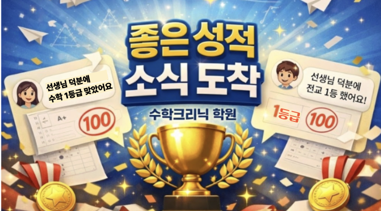 안녕하세요. 수학크리닉학원입니다 ^^ 기말고사 준비 기간 동안 혼신의 힘을 다해 지도해 주신 선생님들, 그리고 끝까지 최선을 다해준 우리 학생들 모두 정말 수고 많았습니다. 학원에서 진행한 다양한 학습 프로그램을 통해 시험이 끝난 후 여러 학생들로부터 기쁜 소식들을 전해주었습니다. 그 소중한 결과들을 함께 나누고자 합니다. 고등학교 수학에서 100점은 결코 쉽게 얻을 수 있는 점수가 아닙니다. 그럼에도 불구하고 당당히 100점을 받아낸 우리 친구들, 정말 자랑스럽습니다. 또, 따로 연락을 주지 않았지만 100점을 받은 친구들 역시 진심으로 축하합니다. 아울러 1등급이 확정적인 성과를 만들어낸 친구들 또한 너무나 훌륭한 결과....... <img src="https://blogthumb.pstatic.net/MjAyNTEyMzBfMTAx/MDAxNzY3MDk3OTI3MjUy.Me4lc74UGSv3VezMlYAtKVUsfpO3LOYibNSWRcSp9bYg.nujz3z3E1MAuZtjUPIXHv2555C2rjWpk-QbkEJNGhqEg.PNG/%BD%BA%C5%A9%B8%B0%BC%A6_2025-12-30_%BF%C0%C8%C4_9.32.02.png?type=s3" />