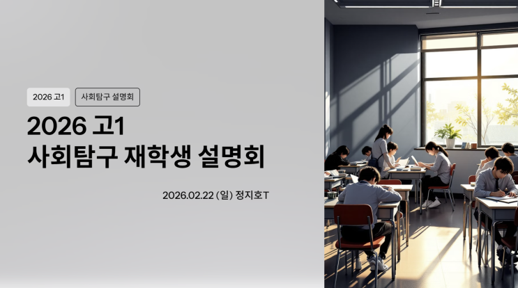 2026년 개학과 함께 3월 3주차부터 봉화캠퍼스(원묵고, 태릉고)와 창조캠퍼스(송곡고, 송곡여고, 혜원여고)에서 사회탐구 과목 정규과정을 개설합니다. (현재 겨울방학 특강으로 고3 수능 사회문화 3월 모의고사 대비, 고1 통합사회 1·2 예습 과정을 진행 중입니다.) ✅ 개설 과목(2022 개정 교육과정) 및 대상 (2026년 3월 기준) 통합사회 : 고1 대상 현대사회와 윤리 : 고2 대상 보다 구체적인 사회탐구 정규과정 운영 계획(안)이 확정되는 대로 다시 안내드리겠습니다. 아래는 2.22(일) 고1 대상 재원생 행사에서 소개한 사회탐구 내용입니다. <img src="https://blogthumb.pstatic.net/MjAyNjAyMjZfMjIy/MDAxNzcyMTAzMTA1NTI0.XgiQ_7I5gn_hYo6WjdqrHxMdV-Vor4rsUnquD0buAdgg.4_Yk5p7S6uhrhquyj7diyXFXVcwjlvUv_vkKDqbDOT0g.PNG/image.png?type=s3" />