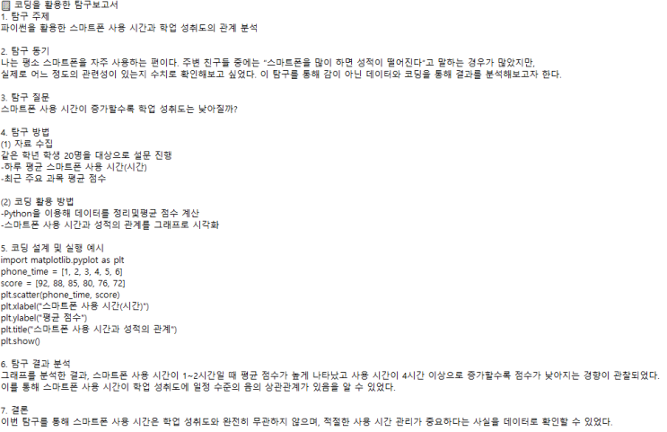 성적만으로는 부족한 고입!! ★탐구보고서★가 합격을 가릅니다 요즘 고등학교 입시는 달라졌습니다. 시험 점수만 잘 받는 학생보다 스스로 탐구하고 정리할 수 있는 학생을 원합니다. 그래서 상위권 학생들은 이미 중학생 때부터 ‘탐구보고서’로 준비합니다. 탐구보고서를 준비하는 학생들이 노리는 고등학교는? 과학적 사고력과 탐구 역량을 보는 → 과학고등학교 / 영재학교 생활기록부 경쟁력이 중요한 → 자사고·특목고 일반고 진학 후에도 → 상위권 학생부 관리가 가능한 학생 **탐구보고서는 ‘어디를 가든 손해 없는 준비’**입니다. ❓ 왜 학원에서 탐구보고서를 해야 할까요? 집에서는 어렵습니다. ❌ 주제 선정이 막....... <img src="https://blogthumb.pstatic.net/MjAyNjAyMjhfMjE4/MDAxNzcyMjU0NTMwMzYz.Q5p0GaIlw-Xf24AazqnDUqkBVjjgo4oxjoZs6KPoG4cg.PK3Y2DAysz_7t4gWKQP-eWO5QY7Iq6NW5b2XrUTYETEg.PNG/image.png?type=s3" />