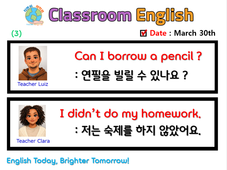 안녕하세요 TEENC 어학원입니다. 이번주도! 새로운 Classroom English로 한 주 힘차게 시작해보아요! * Can I borrow a pencil? : 연필을 빌릴 수 있나요? * I didn't do my homework. : 숙제를 하지 못했어요. <img src="https://blogthumb.pstatic.net/MjAyNjAzMzBfMjI2/MDAxNzc0ODQ5NzU0Mjg5.FZntl2QXgEwgoOxtcmPTQwnOT3RxzNHfu4KTz9dq_TMg.0slYV6ymcr4ISLq6MchOrXQxTtzqjIekuVxSAKSwXr4g.PNG/Classroom_English_3.png?type=s3" />