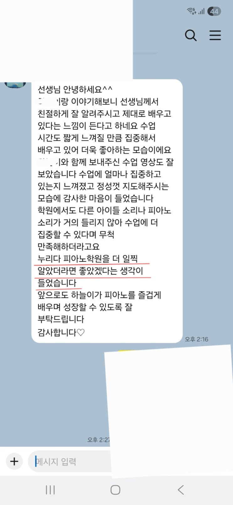 안녕하세요 아름다운 인재를 길러내는 송정누리다음악학원 원장 금누리 입니다. 오랫만에 첫 수업 영상을 올려 드리는것 같아요! 누리다의 특별한 교육방향성을 알아봐 주시는 학부모님들이 많으셔서 아카데미아 수업의 피드백을 뜸 했네요~^^ 요즘 예비초 1학년 어머님들의 문의와 상담.대기가 이어지고 있어요! 소문만 들었던 누리다의 연주 중심 교육을 한번더 피드백 해드려야겠다 생각하여 첫 수업 영상 업로드를 해봅니다 누리다는 주입식 교육의 포본인 고전식 교육의 정성 바이엘 교재를 가르치지 않아요 ㅎㅎ 그럼 뭘로 가르치나요? ~^^ㅎ 바이엘은 200년도 더 된 옛날 우리나라 조선시대에 만들어진 교수법으로 요즘 아이들의 교육 수....... <img src="https://blogthumb.pstatic.net/MjAyNjAxMTNfMjIz/MDAxNzY4MzExNTEzMzY1.PAMSj8YeM2JmRuTejZCcUFSVz5-HoSDPqEg64raNIgsg.p8i7EYtVuRNypNlD9u2Mz-gAu1Pm0uupppfQucDxQMEg.JPEG/900%A3%DFScreenshot%A3%DF20260113%A3%DF223545%A3%DFKakaoTalk.jpg?type=s3" />