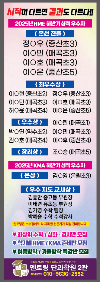 안녕하세요 울산 매곡동 수학학원 멘토링 단과학원입니다 저희 울산 매곡동 수학학원 멘토링 단과학원에서는 초중고 교과 수업과 HME · KMA와 같은 수학 경시대회에서도 꾸준히 좋은 성과를 이어오고 있습니다 이번 2025년 HME • KMA 수학 경시대회에서 수상한 우리 아이들의 소식을 전합니다 어려운 문제 앞에서도 포기하기보다 한 번 더 생각하고 설명을 들으며 고개를 끄덕이던 모습들과 그 시간을 버텨 준 아이들이 있었기에 이런 결과도 따라올 수 있었다고 생각합니다 지금도 묵묵히 자리에서 연필을 잡고 있는 아이들, 잘 안되는 문제도 다시 도전해 주는 아이들, 그 모든 아이들이 참 대견하고 자랑스럽습니다 저희 울산 매....... <img src="https://blogthumb.pstatic.net/MjAyNjAxMTZfMjk3/MDAxNzY4NTM2ODE3NTI2.dtgMXlSxwuu3ny8me6ob5O6pocO3TDqFZSTOhhhhRFUg.h7mlgq_e1ykoKOIub4ba6hWvpBxAvn7XB0qfu70uhuAg.PNG/IMG%A3%DF1250.PNG?type=s3" />