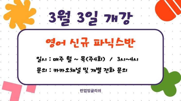 신규 파닉스반 개강 안내 영어 읽기의 시작, 파닉스부터 제대로! 영어 학습의 첫걸음은 소리와 알파벳의 연결을 이해하는 것입니다. 저희 런업잉글리쉬 학원에서는 영어를 처음 접하는 친구들을 위해 신규 파닉스반을 개강합니다! 개강 일정 개강일: 3월 3일 (화요일) 수업 시간: 주 4회(월~목) / 3시 ~ 4시 정원: 소수 정예 마감제 운영 ✨ 수업 특징 ✔ 알파벳 소리부터 차근차근 지도 ✔ 단어 읽기 → 문장 읽기까지 단계별 학습 ✔ 게임과 활동 중심의 즐거운 수업 ✔ 소수 정원으로 꼼꼼한 지도 대상 학생 • 영어를 처음 시작하는 유아/초등 저학년 • 알파벳은 알지만 읽기가 어려운 학생 • 파닉스를 다시....... <img src="https://blogthumb.pstatic.net/MjAyNjAxMjdfMTg2/MDAxNzY5NDkyNDMyMTQy.t21qSIqUjdvYCUsBtEffQlkMbT8eU7q__sbc_vLSsfcg.ZOdckslWe6gNFuIBufWiRZqEsGvLgDVyHEtjgYl6KBEg.JPEG/%BF%F9.jpg?type=s3" />