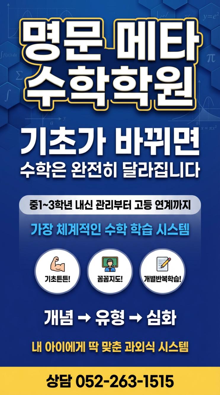 상담을 하다 보면 “우리 아이는 원래 수학이 약한 것 같아요” 라고 말씀하시는 경우가 많습니다. 하지만 실제로는 대부분 방법의 문제인 경우가 많습니다. 아이에게 맞지 않는 수업 방식, 개념이 부족한 상태에서의 문제풀이, 반복 없이 넘어가는 학습 이런 요소들이 쌓이면서 수학이 어려워지는 경우가 많습니다. 명문 메타 수학학원은 학생마다 다른 상태를 정확하게 분석하고 그에 맞는 학습을 진행합니다. 이해가 빠른 학생은 심화 중심으로, 기초가 부족한 학생은 개념부터, 실수가 많은 학생은 반복 교정으로 아이에게 맞는 수업을 제공합니다. 그래서 가능한 것이 내 아이에게 맞춘 과외식 수업입니다. 수학은 타고나는 것이....... <img src="https://blogthumb.pstatic.net/MjAyNjAzMjRfODAg/MDAxNzc0MzYzMzI4NjQ1.0OV2EbePL7jyzLiwWrUh60IYCuz6bd0Dxkb7hTEg0D0g.TzVGNwmjDi8stabTpV-vUGz9KSU-3mMYj42Frs5dR70g.PNG/KakaoTalk_20260324_125205804.png?type=s3" />