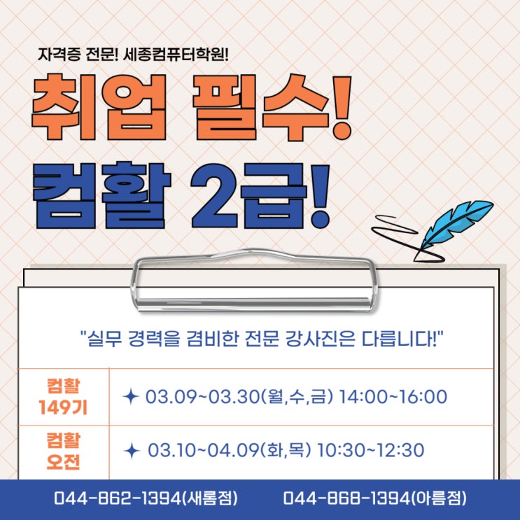 안녕하세요~ 자격증 전문 세종컴퓨터학원입니다. 다음 주 컴활 2급 개강합니다~ 4월까지 자격증 준비를 원하는 분들은 개강 일정 확인 후 서둘러 신청하세요^^ 컴활 자격증은 많은 기업체 모집공고 우대사항만 확인해도 필수라는 걸 알 수 있습니다! 단순히 자격증 취득을 넘어 업무의 질을 결정짓는 핵심 도구인 엑셀 프로그램을 잘 활용하기 위해선 체계적인 교육 시스템을 갖춘 곳을 선택해야 합니다. 국가 기술 자격증으로 공기업 가산점은 물론, 일반 기업 채용 시 사무행정 능력을 증명합니다~ 데이터 분석 기능을 숙달하면 수동으로 처리하여 지연됐던 업무도 자동화하여 업무 효율을 극대화할 수 있습니다^^ 독학으로는 놓치기 쉬운 실무....... <img src="https://blogthumb.pstatic.net/MjAyNjAzMDZfMTc1/MDAxNzcyNzc4MzEzNjA0.-Rg3Pvlz2yiykSPW_G0WdK26OzPXd1C-vcLbCK3QhVsg.B6lI2ahIqNXQjhHfSjmOjQ3nIGcYMS6MfgBbFNcJnOUg.JPEG/%C1%A6%B8%F1%C0%BB_%C0%D4%B7%C2%C7%D8%C1%D6%BC%BC%BF%E4_-001_%2823%29.jpg?type=s3" />