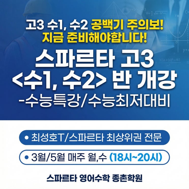 "스스로 한다는 말, 그대로 믿기엔 고3은 너무 중요합니다" 고3 시기는 내신 과목 수가 줄어들면서 학생들에게 여유 시간이 생긴 것처럼 보이기 쉽습니다. 하지만 역설적으로 이때가 학습 밀도가 가장 쉽게 무너지는 위험한 구간이기도 합니다. "EBS 수능특강 곧 시작하겠다"는 말만 반복하다가 기말고사 이후인 7월에야 시작하면, 수능 수학 점수 확보는 매우 어려워집니다. 수능 수학은 막연한 '의지'가 아니라, 공부할 수밖에 없는 **'구조'**로 준비해야 합니다. [수학1·수학2] EBS 수능특강 준비반 상세 안내 스파르타 최상위권 전문 최성호 선생님이 직접 지도하여 점수의 차이를 만듭니다. - 수....... <img src="https://blogthumb.pstatic.net/MjAyNjAyMjZfMzQg/MDAxNzcyMTAxNjg0NTM5.V0cH7BsY1Y5JBq_ApIavE3CXQk8_zsbmXbbTofcIi20g.srToUuqMma0SG82cd3hJQ1fIqxnCSZTiDVpCrGIzI2kg.JPEG/KakaoTalk_20260226_192718622.jpg?type=s3" />