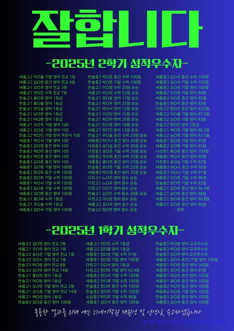새롬동 21세기학원 새롬동 영어학원 새롬동 수학학원 새롬동 21세기학원 새롬동 영어학원 새롬동 수학학원 2025년, 한해의 성적을 집계해봅니다. 언제나처럼 학생들의 성적 향상을 위해 고생해주신 선생님들 감사합니다. 믿고 따라준 21세기학원 재원생들, 고생 많았다. 2026년에는 너의 이름도! 2026년엔 학부모님의 자녀 이름도! 2026년에 21세기학원 전체 재원생의 이름이! 성적우수자 명단에 올라가길 기원합니다. +) 생각만큼 극적인 성적향상이 없었던 학생들도 분명 있습니다. 2026년엔, 더 열심히 성적 올려보겠습니다. <img src="https://blogthumb.pstatic.net/MjAyNjAyMTBfMTA0/MDAxNzcwNzAwNjg5OTY4.aDj3zs-ZiVmuvE23EgzbUoYZhgI9gKb1KqN2Tht4lzUg.95sida3LONTrqnva1Xj2-p6dJZ8D7jZiRUK4QqETXrgg.JPEG/%C0%DF%C7%D5%B4%CF%B4%D9_%285%29.jpg?type=s3" />