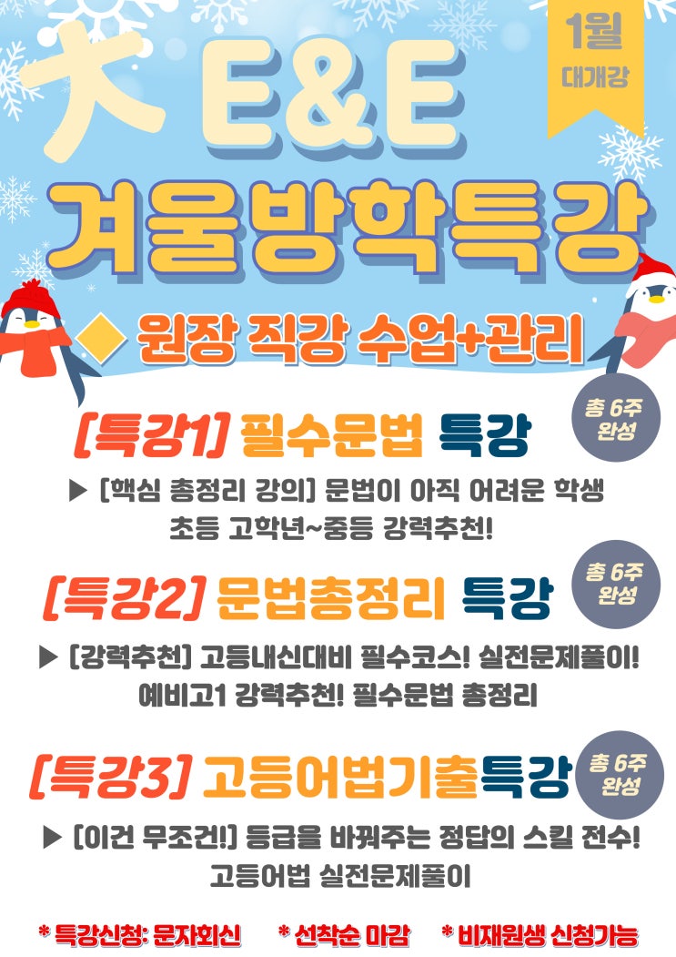 이앤이 영어학원 방학특강 안내 안녕하세요. 이앤이 영어학원 원장입니다. 방학이 시작되면 학부모님들께서 가장 많이 하시는 질문이 있습니다. “이번 방학에 영어, 뭘 시켜야 할까요?” “지금 실력에서 정말 달라질 수 있을까요?” 이 질문에 대해, 저는 늘 같은 답을 드립니다. **방학은 영어 실력을 ‘쌓는 시기’가 아니라, ‘바꾸는 시기’**라고요. 그리고 바로 그 시기를 위해 이번 이앤이 영어학원 방학특강을 준비했습니다. 단순한 수업이 아닙니다 6주 안에 핵심을 완성하는 집중 과정 이번 방학특강은 “수업 시간만 늘린 보강”이 아닙니다. 2달 이상 준비한 커리큘럼으로, 각 레벨별 학생들이 가장 많이 막히는 지점을 분석해 반....... <img src="https://blogthumb.pstatic.net/MjAyNjAxMTJfMjk1/MDAxNzY4MTg5ODY3NDgz.D4uomPE39yrcXQJgJk_YgR_Fj-LvJH8FwLcpmSDifEUg.4GIikRTfIr8-bW-Ou4Vmji0spDglclYDKAEFTdCJqX8g.JPEG/001.jpg?type=s3" />