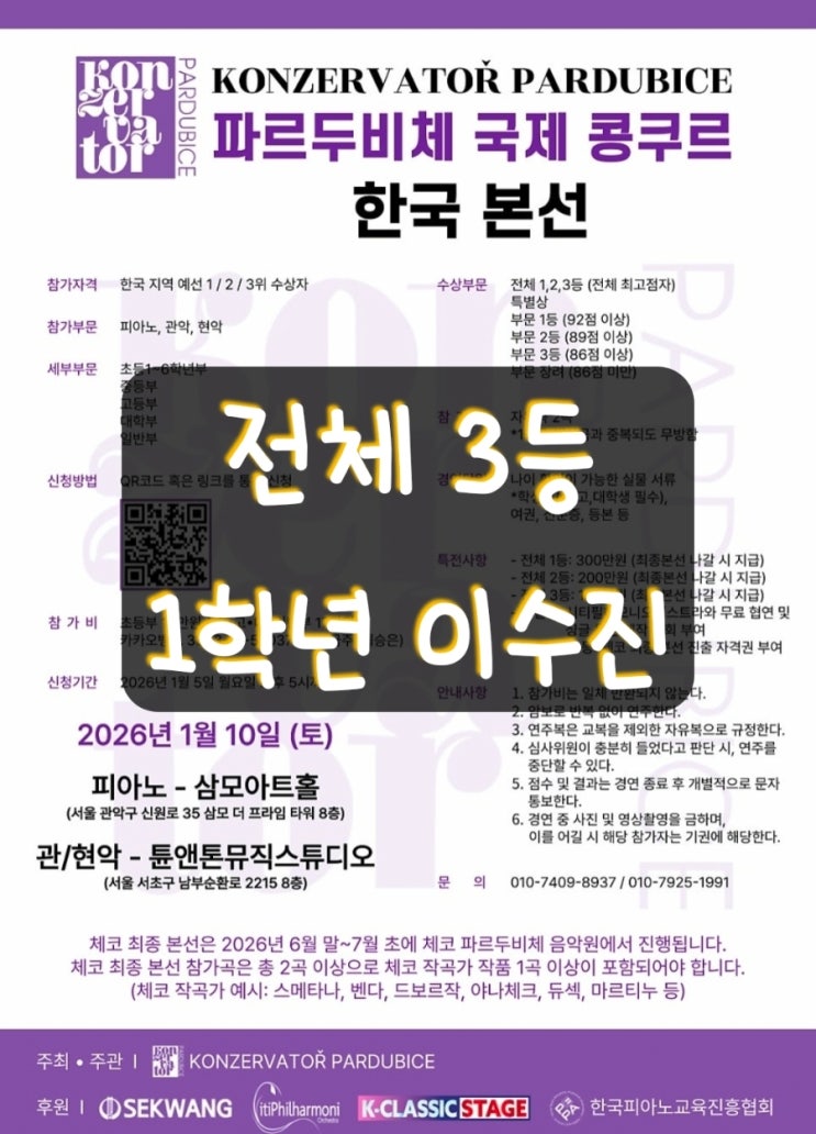 " 파르두비체 국제 콩쿠르 한국 본선 " 삼모아트홀 /2026년1월10일 터치음악학원 전공반 학생들이 체코 **파르두비체 콘서바토리(Konzervatoř Pardubice)**가 주관하는 파르두비체 국제 콩쿠르 한국 본선에 참가하여 값진 성과를 거두었습니다. 파르두비체 국제 콩쿠르는 체코 현지 음악원 최종 본선으로 이어지는 국제 콩쿠르로, 유럽 음악 교육 기준에 맞춘 심사를 통해 연주자의 음악적 깊이와 표현의 진정성을 중요하게 평가하는 대회입니다. 자유곡 2곡을 통해 작품 이해도와 집중력, 그리고 무대 위에서 음악을 끝까지 완성해 가는 힘을 갖게 하는 콩쿠르곡은 예중·예고·음대 입시에서 요구되는 실기 과정과 매우 닮아 있습니다....... <img src="https://blogthumb.pstatic.net/MjAyNjAxMTRfNTEg/MDAxNzY4MzY0Njc0NDIy.4op8CMbKk3Jwof_AVZhOlCZ8l_yNJww7j7tCNGIbaW0g.Ziqd8WoRvb-5QKbELslDaD7DslrKLmzT5EWuG8AdDrkg.JPEG/900%A3%DF20260114123706.jpg?type=s3" />