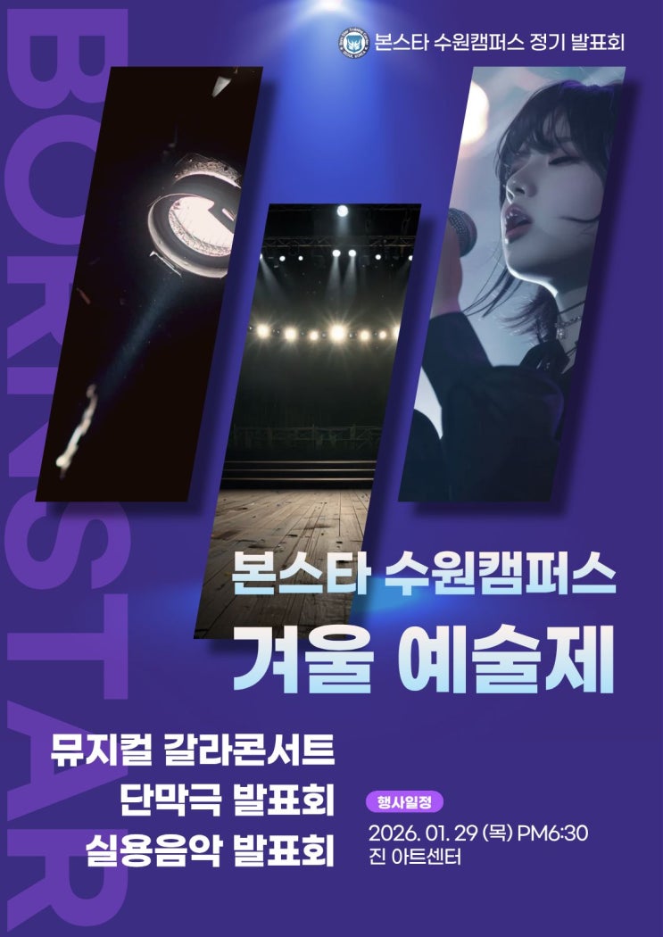안녕하세요 본스타수원캠퍼스입니다! 너무 오랜만에 블로그 소식을 올리네요^^ 오랜만에 아주 반가운 소식이 있어 블로그 공지를 하려 합니다 ^^ 바로바로 공연소식인데요^^ 우리 본스타 수원 캠퍼스에서 이번 겨울 방학을 맞이하여 겨울 예술제로 공연을 진행하려 합니당 짝짝짝!!!! 뮤지컬 갈라 콘서트, 단막극 발표와 실용 음악 무대까지... 볼걸리, 들을거리 풍성 하구요>< 우리 학생들 다들 열심히 준비중 이니깐, 많이들 오셔서 응원해주시고 따뜻한 관심 부탁드려용^^ 관람을 원하시는 분들은 전석 무료 공연이니 친구, 친지, 가족분들 다 모시고 즐거운 마음으로 찾아주심 감사하겠습니당^^ 문의 : 031-211-3004 카톡문의 : 본스타....... <img src="https://blogthumb.pstatic.net/MjAyNjAxMTdfMjQ0/MDAxNzY4NjE1NjgxNDUy.DxuehuGMX1rpHs17QxfkQjAxxZ28SmoIQswajlc1iesg.PksqvZiWr9-a05jDLVrEQhX6jXvZo0e6sI8Le9BpDNkg.JPEG/KakaoTalk_20260105_182744509.jpg?type=s3" />